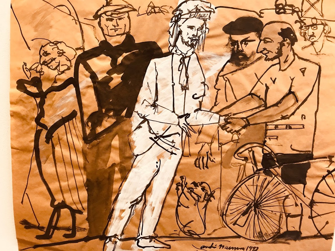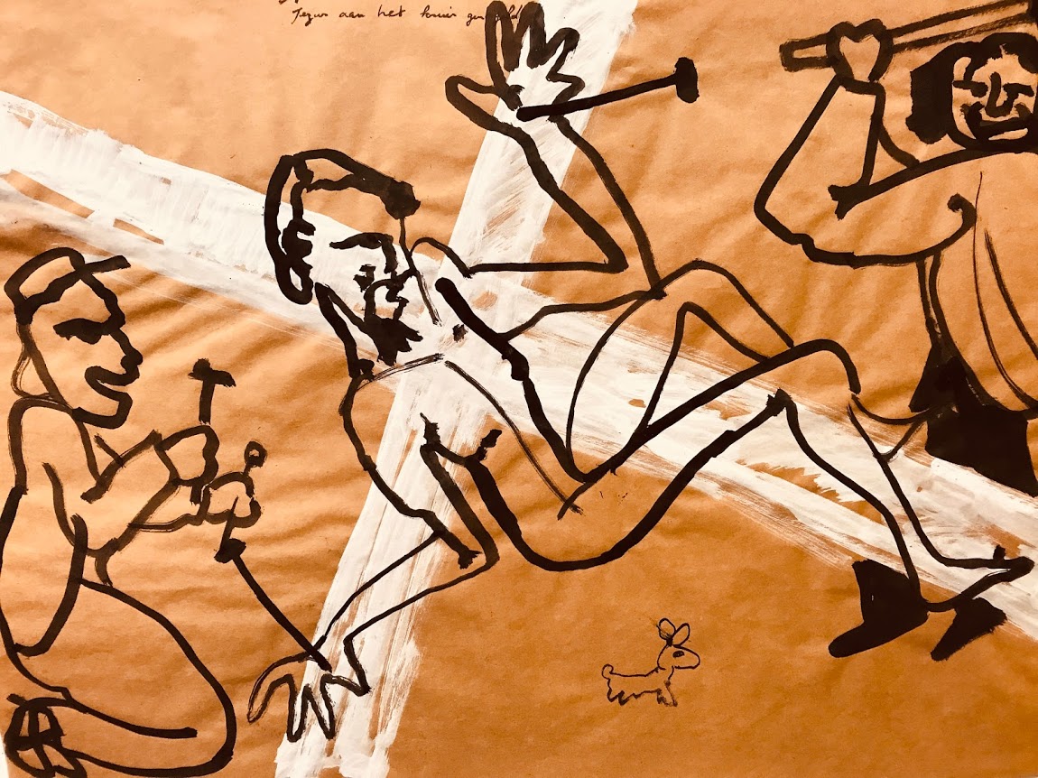 Galerist Wouter de Bruycker weet in zijn Antwerpse galerij opnieuw de aandacht te trekken met verrassend werk van André Naessens. Op humoristisch accurate wijze (is dit geen oxymoron?) slaagt deze kunstenaar erin om de bijbelse geschiedenis met een knipoog neer te zetten. Wat een plezier hebben de beulen terwijl ze Jezus aan het kruis nagelen. Saillant detail: de werken zelf zijn tegen de wand van de galerij opgehangen met … bloknageltjes. Een Emmaüsganger die met de fiets gekomen is, en de moord op de onnozele kinderen met een obese engel in de lucht. Vooral in de laatste werk bewijst de kunstenaar dat het een weldoordachte knipoog is. Wie de tijd neemt om het werk tot zich te laten komen, zal een aantal referenties aan de kunstgeschiedenis voorbij zien komen in dit Breugeliaanse landschap.